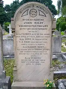 Rigby's grave in Woolton became a landmark for Beatles fans visiting Liverpool.[14][128] A digitised image of the headstone was added to the 1995 music video for the Beatles' reunion song "Free as a Bird".[107] Continued interest in a possible connection between the real-life Eleanor Rigby and the 1966 song led to the deeds for the grave being put up for auction in 2017,[14][128] along with a Bible that once belonged to Rigby and a handwritten score for the track (subsequently withdrawn) and other items of Beatles memorabilia.[129]