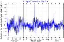 Electra may be a variable star, and it appears in the New Catalogue of Suspected Variable Stars as NSV 15755. Low amplitude variability of the brightness of Electra was detected by Kepler/K2, and Fourier analysis of the star's light curve shows several periods of oscillation, the strongest being 1.107 and 1.165 days.[16] The International Variable Star Index classifies it as a slowly pulsating B star.[17]