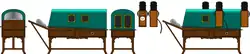 The electric bath consisted of a wooden stand which contained an electrical power supply. Above the wooden stand was a green sheet-metal cabinet lid which contained many ultraviolet lamps, and four additional lamps which could be set into the lid and hooked in with metallic clamps. The additional lamps were placed on either side of the bath lid, as well as at the end to provide the user with extra tanning around the arm and feet areas.