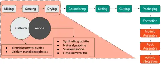There are mainly three stages during the manufacturing process of EV batteries: materials manufacturing, cell manufacturing and integration, as shown in Manufacturing process of EV batteries graph in grey, green and orange color respectively. This shown process does not include manufacturing of cell hardware, i.e. casings and current collectors. During the materials manufacturing process, the active material, conductivity additives, polymer binder and solvent are mixed first. After this, they are coated on the current collectors ready for the drying process. During this stage, the methods of making active materials depend on the electrode and the chemistry. For the cathode, two of the most popular chemistry are transition metal oxides, i.e. Lithium nickel manganese cobalt oxides (Li-NMC) and Lithium metal phosphates, i.e. Lithium iron phosphates (LFP). For the anode, the most popular chemistry now is graphite. However, recently there have been a lot of companies started to make Si mixed anode (Sila Nanotech, Prologium) and Li metal anode(Cuberg, Solid Power). In general, for active materials production, there are three steps: materials preparation, materials processing and refinement. Schmuch et al. discussed materials manufacturing in greater details.[34]