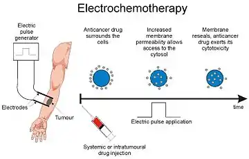 Electrochemotherapy is a type of chemotherapy that allows delivery of non-permeant drugs to the cell interior. It is based on the local application of short and intense electric pulses that transiently permeabilize the cell membrane, thus allowing transport of molecules otherwise not permitted by the membrane.[1][2] Applications for treatment of cutaneous and subcutaneous tumors have reached clinical use by utilizing drugs such as bleomycin or cisplatin).[3][4][5][6][7][8][9][10][11][12] Electrochemotherapy with bleomycin was used to treat a patient for the first time in 1991 at the Institute Gustave Roussy in France,[13] while electrochemotherapy with cisplatin was used to treat for the first time in 1995 at the Institute of Oncology, Ljubljana, Slovenia.[14] Since then, more than 4000 patients were treated with electrochemotherapy all over the world (Argentina, Australia, Austria, Belgium, Bulgaria, Denmark, France, Germany, Greece, Hungary, Ireland, Italy, Japan, Mexico, Nicaragua, Poland, Portugal, Slovenia, Spain, Sweden, UK, USA). Recently, new electrochemotherapy modalities have been developed for treatment of internal tumors using surgical procedures, endoscopic routes, or percutaneous approaches to gain access to the treatment area.[15][16]