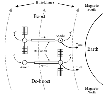 Take, for example, the NASA Propulsive Small Expendable Deployer System (ProSEDS) mission as seen in above figure.[4][5][6][7][8] At 300 km altitude, the Earth's magnetic field, in the north-south direction, is approximately 0.18–0.32 gauss up to ~40° inclination, and the orbital velocity with respect to the local plasma is about 7500 m/s. This results in a Vemf range of 35–250 V/km along the 5 km length of tether. This EMF dictates the potential difference across the bare tether which controls where electrons are collected and / or repelled. Here, the ProSEDS de-boost tether system is configured to enable electron collection to the positively biased higher altitude section of the bare tether, and returned to the ionosphere at the lower altitude end. This flow of electrons through the length of the tether in the presence of the Earth's magnetic field creates a force that produces a drag thrust that helps de-orbit the system, as given by the above equation. The boost mode is similar to the de-orbit mode, except for the fact that a High Voltage Power Supply (HVPS) is also inserted in series with the tether system between the tether and the higher positive potential end. The power supply voltage must be greater than the EMF and the polar opposite. This drives the current in the opposite direction, which in turn causes the higher altitude end to be negatively charged, while the lower altitude end is positively charged(Assuming a standard east to west orbit around Earth).