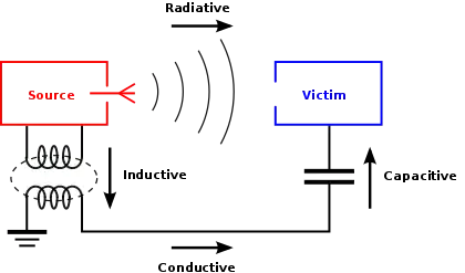 There are four basic coupling mechanisms: conductive, capacitive, magnetic or inductive, and radiative. Any coupling path can be broken down into one or more of these coupling mechanisms working together. For example the lower path in the diagram involves inductive, conductive and capacitive modes.