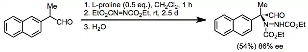Azo compounds afford hydrazines after addition to the N=N bond. These additions have been rendered enantioselective through the use of chiral auxiliaries (see above) and chiral catalysts.[9] Although the enantioselectivity of the proline-catalyzed process is good, yields are low and reaction times are long.