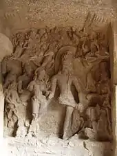 The northern entrance to the cave is flanked by two panels of Shiva dated to the Gupta period, both damaged. The left panel depicts Yogishvara (Shiva as the Lord of Yoga) and the right shows Nataraja (Shiva as the Lord of Dance).[26] The Sadashiva is flanked by two large friezes, one of Ardhanarishvara and the other of Gangadhara.[27] The walls of the mandapa feature other Shaivism legends. All the friezes, states Stella Kramrisch, feature the vyaktavyakta concept of Samkhya, where the state of spiritual existence transitions between the unmanifest-manifest, the figures leap out of the cave walls towards the spectator as if trying to greet the narrative. Even the manifested Sadashiva is shown to be rising out of the rocks.[27]