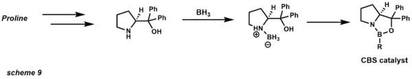 - Corey-Itsuno reduction, also known as the Corey-Bakshi-Shibata reduction, is an enantioselective reduction of ketones to alcohols utilizing an oxazaborolidine catalyst and various boranes as the stoichiometric reductant.[29] The Corey group first demonstrated the synthesis of the catalyst using borane and chiral aminoalcohols. The reaction uses the chiral amino acid proline and in the presence of borane leads to the CBS catalyst (scheme 9).[30][31]