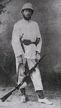 Between 1886 and 1894, Modigliani explored Sumatra and a number of islands off its western coast.[2] His first trip, in 1886, was to the island of Nias, of which he explored the southern region (Nias Salatan), travelling among head-hunting tribes. He came back unscathed, and wrote his first book, Un viaggio a Nias. Nias Salatan at the time was forbidden territory for all foreigners, and Dutch military and naval expeditions had failed time and again to impose colonial rule in this region, populated by redoutable head hunters.[3] Moreover, the head hunters' villages were at war with each other at the time of his visit, and Modigliani was travelling with the sole company of four Javanese tracker hunters, i.e., virtually undefended; and he personally clashed with high-ranking members of Nias society, including the redoutable Siwa Sahilu, who commanded some 2,000 warriors out of his village of Hili Simaetano. Yet, Elio Modigliani managed to save his own head and that of his men, and bring back a formidable collection of Nias artefacts for the Ethnographic Museum of Florence, where they are presently on display.[4] During his exploration, Modigliani was faced on several occasions with highly dangerous situations, and yet he never had to fire a shot nor even to level his weapons against a warrior. He managed to resolve any conflict through a mixture of psychological warfare and empathy. Likewise, his main opponent, Chief Siwa Sahilu, was a subtle strategist and his equal at this game. Their dueling was reconstructed through the research of Vanni Puccioni, who in 2010 collected the memories of the warriors' descendants in Nias Salatan.[5]