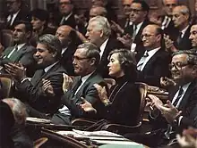 In 1970, Elisabeth Kopp became a municipal councilor (Gemeinderat) of Zumikon, and in 1974 the first female president of a municipality in the canton of Zurich.[4] Between 1972 and 1979, she served on the executive council of the canton of Zürich as a representative for the FDP.[4] For the FDP, Kopp was a candidate to the National Council in the Federal Elections of 1975 supported from the Women Central of Zurich and even though she was not elected, received an encouraging result.[14] For the Federal Election of 1979, she campaigned focusing on her experience as the president of Zumikon.[14] She would be elected with 52,113 votes.[14] As a member of the FDP, she served in the National Council of Switzerland from 1979 to 1984.[15] For the first seven sessions she mainly observed and only introduced one motion demanding from the Federal Council to examine the possibilities for encouraging saving.[16]