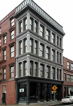 The building was designed by Alfred Stone[2] and is one of Providence's few surviving commercial buildings with a cast iron facade. The facade is five bays wide, the bays separated by engaged Corinthian columns, with each floor separated from the next by an entablature with bracketed frieze. The outer bays have paired windows, while the three inner bays have larger sash windows. The decorative elements of the main facade are continued for a bay with paired windows on the left side elevation.[3]