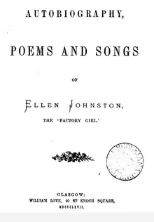 In 1867 she published her autobiography, Poems and Songs of Ellen Johnston, the ‘Factory Girl.[3]