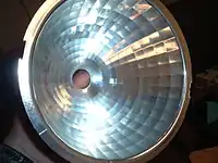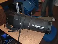 Ellipsoidals are supplied with a certain size lens or lenses that determines the field angle, anywhere from five to ninety degrees. Field angle is the angle of the beam of light where it reaches 10% of the intensity of the center of the beam. Most manufacturers now use field angle to indicate the fixture's spread typically in this series (5°, 10°, 19°, 26°, 36°, 50°, 75°, 90°). Older fixtures are described by the width of the lens x focal length of the instrument. For example, a 6x9 ellipsoidal would have a 6" diameter lens and a focal length of 9". 6x9 Instruments have a field angle of approximately 37°. 6x12 instruments have a field angle of approximately 27°. As the field angle narrows, the instrument can be used further from the stage. Variable focus (zoom) instruments with two lenses that move in and out from the lamp housing are also available, allowing the user to manually adjust to the desired focal length within a certain range. Ellipsoidals can be used for any job but their primary function is to illuminate a specific proximity. They are the common use for spotlights as they can give a small sharp circle. It has an ellipsoidal reflector behind the lamp to reflect the light in the direction required. They have brackets on the end to attach gels and barn doors. Barn doors do the same as the shutters but give a softer edge. [1]