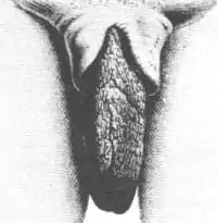 Elongated labia (also known as sinus pudoris or macronympha,[1] and colloquially as khoikhoi apron or hottentot apron) is a feature of certain Khoikhoi and other African women who develop, whether naturally or through artificial stretching, relatively elongated labia minora, which may hang up to four inches outside the vulva when they are standing in an upright position.