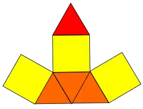 In geometry, the elongated triangular pyramid is one of the Johnson solids (J7). As the name suggests, it can be constructed by elongating a tetrahedron by attaching a triangular prism to its base. Like any elongated pyramid, the resulting solid is topologically (but not geometrically) self-dual.