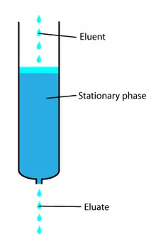 In a liquid chromatography experiment, for example, an analyte is generally adsorbed, or "bound to", an adsorbent in a liquid chromatography column. The adsorbent, a solid phase (stationary phase), is a powder which is coated onto a solid support. Based on an adsorbent's composition, it can have varying affinities to "hold" onto other molecules—forming a thin film on the surface of its particles. Elution then is the process of removing analytes from the adsorbent by running a solvent, called an "eluent", past the adsorbent/analyte complex. As the solvent molecules "elute", or travel down through the chromatography column, they can either pass by the adsorbent/analyte complex or they can displace the analyte by binding to the adsorbent in its place. After the solvent molecules displace the analyte, the analyte can be carried out of the column for analysis. This is why as the mobile phase passes out of the column, it typically flows into a detector or is collected for compositional analysis.