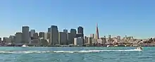 The Embarcadero is the eastern waterfront and roadway of the Port of San Francisco, San Francisco, California, along San Francisco Bay. It was constructed on reclaimed land along a three mile long[2] engineered seawall, from which piers extend into the bay. It derives its name from the Spanish verb embarcar, meaning "to embark"; embarcadero itself means "the place to embark." The Central Embarcadero Piers Historic District was added to the National Register of Historic Places on November 20, 2002.[1]
