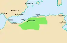 Abdelkader was born in el Guetna, a town and commune in Mascara on September 6 1808,[5] to a religious family. His father, Muhieddine (or "Muhyi al-Din") al-Hasani, was a muqaddam in a religious institution affiliated with the Qadiriyya tariqa[6] and claimed descendence from Muhammad, through the Idrisid dynasty.[7] Abdelkader was thus a sharif, and entitled to add the honorary patronymic al-Hasani ("descendant of Hasan ibn Ali") to his name.[6]