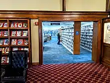 The main feature on the façade is a 4-foot-tall clock with Roman Numerals. Inside, the leaded glass window of the Archangel Michael-1892 by Otto Heinigke (1851–1915) and Owen J. Bowen (1873–1967) dominate the main reading room. The original collection of 1,500 reference books took up the stacks until a modernization in 1945 removed the public barrier. Until then librarians handled book requests and fetched the tomes for review. This modernization left intact the reading alcoves (where the fireplaces were) and others were added. Prior to WWII, the only improvements were to the lights, which were electrified in 1913. There was an additional outbuilding which served as a home for the librarian and also a number of groundskeepers, it fell victim to a fire in 1945.