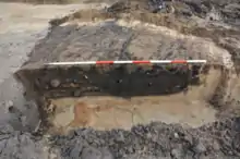 In 2017, archaeologists from Moesgaard Museum conducted a magnetometer survey on the site in Endebjerg to see if there were any traces of a building underneath the top soil.[9] During the survey some clear anomalies were detected that were interpreted as possible pits. The anomalies were mostly clustered on the eastern side of the hill, near where Christian Adamsen had previously found the settlement. On five of these anomalies, test holes were dug to determine if there was any archaeological context to be found. In three of the test holes, archaeological context was discovered, which meant these areas were of particular interest.