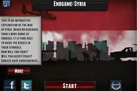 Endgame: Syria is a trading card based newsgame developed by GameTheNews.net, a project looking to turn news into games. It launched on the 12 December 2012 and claimed to be the first ever attempt to cover an ongoing conflict in the form of a video game.[1] It attracted a range of responses from the positive[2][3] to critical.[4] The game places the player in the role of coordinating the rebel side of the Syrian Civil War, where they have to decide the political and military choices faced in resolving the conflict. An iOS version was planned, but cancelled due to conflicts with Apple's developer rules concerning its subject matter.