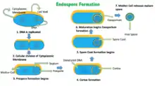 When a bacterium detects environmental conditions are becoming unfavourable it may start the process of endosporulation, which takes about eight hours. The DNA is replicated and a membrane wall known as a spore septum begins to form between it and the rest of the cell. The plasma membrane of the cell surrounds this wall and pinches off to leave a double membrane around the DNA, and the developing structure is now known as a forespore. Calcium dipicolinate, the calcium salt of dipicolinic acid, is incorporated into the forespore during this time. The dipicolinic acid helps stabilize the proteins and DNA in the endospore.[16]:141 Next the peptidoglycan cortex forms between the two layers and the bacterium adds a spore coat to the outside of the forespore. In the final stages of endospore formation the newly forming endospore is dehydrated and allowed to mature before being released from the mother cell.[3] The cortex is what makes the endospore so resistant to temperature. The cortex contains an inner membrane known as the core. The inner membrane that surrounds this core leads to the endospore's resistance against UV light and harsh chemicals that would normally destroy microbes.[3] Sporulation is now complete, and the mature endospore will be released when the surrounding vegetative cell is degraded.