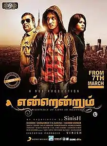 Endrendrum (lit.โ'Everlasting') is a 2014 Tamil film written, produced, and directed by Ssinish Sreedharan. It started off as a short film, and over the period of time, it was developed in to a tele-feature film. The film stars Sathish Krishnan and Priyanka Reddy in the lead roles, and Sai Dheena, Theepetti Ganesan, Meera Krishnan, Misha Ghoshal, Bala Saravanan, and Yogi Babu in other roles. The music was composed by Dharan Kumar, and film was edited by Tirupattur Sathyanarayan Suresh. The film was released on 7 March 2014.[1][2] This film plot is loosely based on Just Like Heaven .