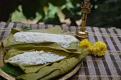 | Main ingredients | Rice flour, turmeric leaves, black gram, coconut or chhena , jaggery, black pepper |