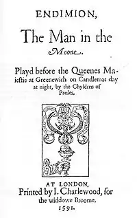 Endymion, the Man in the Moon is an Elizabethan era comedy by John Lyly, written circa 1588.[1] The action of the play centers around a young courtier, Endymion, who is sent into an endless slumber by Tellus, his former lover, because he has spurned her to worship the ageless Queen Cynthia. The prose is characterised by Euphuism, Lyly's highly ornate, formalised style, meant to convey the intelligence and wit of the speaker. Endymion has been called "without doubt, the boldest in conception and the most beautiful in execution of all Lyly's plays."[2] Lyly makes allusions to ancient Greek and Roman texts and traditional English folklore throughout the play. While the title and characters are references to the myth of Endymion, the plot sharply deviates from the classical story and highlights contemporary issues in Elizabeth I's court through its allegorical framework.