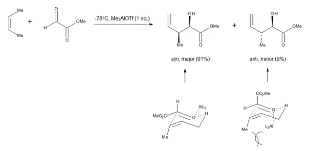 The study of Lewis acid promoted carbonyl-ene reactions, such as aluminum-catalyzed glyoxylate-ene processes (Figure 4), prompted researchers to consider a chair-like conformation for the transition state of ene reactions which proceed with relatively late transition states.[2] The advantage of such a model is the fact that steric parameters such as 1,3-diaxial and 1,2-diequatorial repulsions are easy to visualize, which allows for accurate predictions regarding the diastereoselectivity of many reactions.[2]