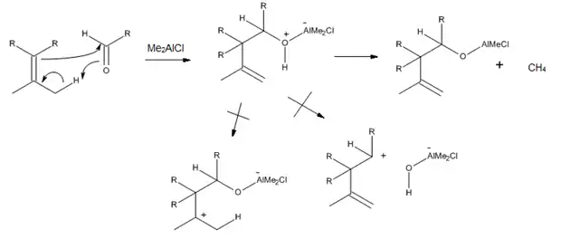Since a Lewis acid can directly complex to a carbonyl oxygen, numerous trialkylaluminum catalysts have been developed for enophiles that contain a C=O bond. In particular, it was found that Me2AlCl is a very useful catalyst for the ene reactions of α,β-unsaturated aldehydes and ketones, as well as of other aliphatic and aromatic aldehydes. The reason behind the success of this catalyst is the fact that the ene-adduct- Me2AlCl complex can further react to afford methane and aluminum alkoxide, which can prevent proton-catalyzed rearrangements and solvolysis (Figure 9).[3]