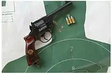 After the First World War, it was decided by the British Government that a smaller and lighter .38 calibre (9.2 mm) sidearm firing a long, heavy 200 grain (13 g) soft lead bullet would be preferable to the large Webley service revolvers using the .455 (11.6 mm) round.[1][2] While the .455 had proven to be an effective weapon for stopping enemy soldiers, the recoil of the .455 cartridge complicated marksmanship training.[3] The authorities began a search for a double-action revolver with less weight and recoil that could be quickly mastered by a minimally trained soldier,[4] with a good probability of hitting an enemy with the first shot at extremely close ranges.[5] By using a long, heavy, round-nosed lead bullet in a .38 calibre cartridge, it was found that the bullet, being minimally stabilised for its weight and calibre, tended to 'keyhole' or tumble longitudinally when striking an object, theoretically increasing wounding and stopping ability of human targets at short ranges.[6][7] At the time, the .38 calibre Smith & Wesson cartridge with 200-grain (13 g) lead bullet, known as the .38/200, was also a popular cartridge in civilian and police use (in the US, the .38/200 or 380/200 was known as the ".38 Super Police" load).[7] Consequently, the British firm of Webley & Scott tendered their Webley Mk IV revolver in .38/200 calibre.[8] Rather than adopting it, the British authorities took the design to the Government-run Royal Small Arms Factory at Enfield, and the Enfield factory came up with a revolver that was very similar to the Webley Mk IV .38, but internally slightly different. The Enfield-designed pistol was quickly accepted under the designation "Revolver, No 2 Mk I" (single/double action, with a hammer spur), and was adopted in 1931,[9] followed in 1938 by the Mk I* (lightened trigger pull, spurless hammer, double-action only),[10] and finally the Mk I** (simplified for wartime production) in 1942.[11]