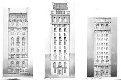 That July, the committee examined over 500 drawings submitted for the two sites.[61][74][lower-alpha 4] Whitfield & King, a relatively obscure firm that had nonetheless been formally invited,[68] won the commission for the Engineers' Club Building.[74][75] Nepotism may have been a factor in the Engineers' Club commission, as Carnegie was married to Whitfield's sister Louise.[23][76] Hale & Rogers and Henry G. Morse, who had not been formally invited, were hired to design the Engineering Societies' Building.[74][75]