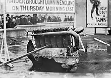 A second attempt was made on 5 December with 19 Gothas and two Giants from Rfa 501. This time, a greater proportion of the bombs were incendiaries. Three Gothas turned back early and only six Gothas were able or willing to penetrate the London defences. Fires were started at Rose's lime juice factory near Liverpool Street Station, in clothing workshops at Whitechapel Road and a factory in Gray's Inn Road. Other incendiaries and bombs landed in a wide area south of the Thames from Balham to Stockwell. For the first time, the London guns successfully shot down one of the raiders, although it managed to reach Canterbury before crashing.[39] A second bomber was hit by guns at Canvey Island and landed on the airfield at RFC Rochford; the crew surrendered their Gotha, the first that had been captured intact by the Allies, but an RFC officer took a flare pistol as a souvenir and accidentally discharged it into the fuselage, destroying much valuable intelligence.[40] One other Gotha failed to return and was presumed to have been lost at sea, while two more crashed in Belgium and yet another was wrecked on landing, a total of six lost aircraft. Total damage from the 260 incendiary and 13 HE bombs that landed on the capital amounted to £92,000; two civilians were killed and another by a falling anti-aircraft shell. It was recognised that the emphasis on incendiaries was not having the intended effect, and later raids would use a greater proportion of high explosive bombs.[41] On 12 December, the England Squadron was tasked with the tactical bombing of British camps at Ypres, during which Klein was shot down and killed by fighters from No. 1 Squadron RFC. Temporary command passed to Oberleutnant Richard Walter, the senior flight commander.[42]