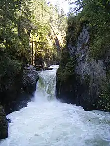 Englishman River Falls Provincial Park is a popular tourist destination approximately 10 km (6.2 mi) upstream from the mouth of the river. It is famed for its two picturesque waterfalls and treed campsites. The park was created on December 20, 1940, in an effort to protect the old-growth forest and its associated ecosystem along the river in the vicinity of the waterfalls.[2]