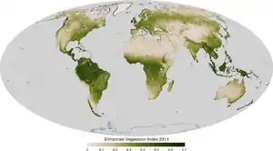 An example of the utility of EVI was reported by Huete et al. (2006).[7] Previously, the Amazon rainforest was viewed as having a monotonous growing season, where there is no particular seasonality to plant growth. Using the MODIS EVI product, Huete et al. showed that the Amazon forest exhibits a distinct increase in growth during the dry season. This phenomenon has implications for our understanding of the carbon cycle and sinks in the region, though it is unclear whether this is a long-standing pattern or an emergent shift associated with climate change.