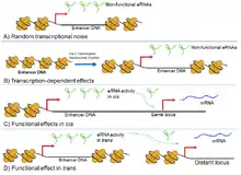Enhancer RNAs (eRNAs) represent a class of relatively long non-coding RNA molecules (50-2000 nucleotides) transcribed from the DNA sequence of enhancer regions. They were first detected in 2010 through the use of genome-wide techniques such as RNA-seq and ChIP-seq.[1][2] eRNAs can be subdivided into two main classes: 1D eRNAs and 2D eRNAs, which differ primarily in terms of their size, polyadenylation state, and transcriptional directionality.[3] The expression of a given eRNA correlates with the activity of its corresponding enhancer in target genes.[4] Increasing evidence suggests that eRNAs actively play a role in transcriptional regulation in cis and in trans, and while their mechanisms of action remain unclear, a few models have been proposed.[3]