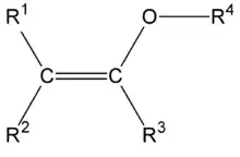 In organic chemistry an enol ether is an alkene with an alkoxy substituent.[1] The general structure is R2C=CR-OR where R = H, alkyl or aryl. A common subfamily of enol ethers are vinyl ethers, with the formula ROCH=CH2. Important enol ethers include the reagent 3,4-dihydropyran and the monomers methyl vinyl ether and ethyl vinyl ether.