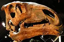 In 2001, Jason Head re-evaluated the phylogenetic position of Eolambia based on specimens stored at the OMNH. He recognized Kirkland's identification of supposed lambeosaurine distinguishing traits in Eolambia as either erroneous or dubious. As demonstrated by Head, there is actually a foramen on the premaxilla; the premaxilla only borders the nostril on the bottom edge; there are two finger-like processes at the front of the maxilla in addition to the shelf; high neural spines of the caudal vertebrae also occur in the non-lambeosaurines Ouranosaurus and Bactrosaurus; and the expansion of the tip of the ischium also occurs in Camptosaurus, Iguanodon, Ouranosaurus, Gilmoreosaurus, and Bactrosaurus, indicating that the expansion is plesiomorphic for iguanodonts and was secondarily lost in hadrosaurines.[19] While M.L. Casanovas and colleagues in 1999 characterized lambeosaurines as having an "expanded foot" at the tip of the ischium, as opposed to a "club-like" condition,[21] Head argued that Corythosaurus and Lambeosaurus[22] have ischial tips no more expanded than those of Mantellisaurus or Ouranosaurus.[4][23]
