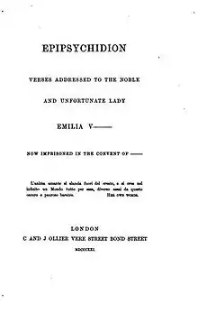 Epipsychidion is a major poetical work published in 1821 by Percy Bysshe Shelley. The work was subtitled: Verses addressed to the noble and unfortunate Lady Emilia V—, now imprisoned in the convent of —. The title is Greek for "concerning or about a little soul", from epi, "around", "about"; and psychidion, "little soul".