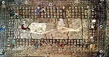 In the Late Byzantine period, the icon depicting the burial of Jesus was commonly painted below a Christ Pantocrator in the apse of the prothesis (the chapel where the Liturgy of Preparation was performed) in Orthodox churches, illustrating a liturgical hymn which celebrated Christ "On the throne above and in the tomb below".[3] The icon, in particular a panel mosaic version taken to Rome, probably in the 12th century, developed in the West into the subject Man of Sorrows, which was enormously popular in the Late Middle Ages, though that image shows a living Christ, normally with eyes open.