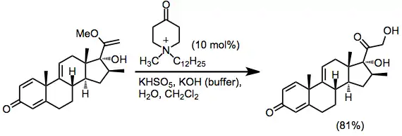 Epoxidations employing aqueous Oxone and a catalytic amount of ketone are convenient if a specialized dioxirane must be used (as in asymmetric applications) or if isolation of the dioxirane is inconvenient. Hydrolytic decomposition of the epoxidation product may be used to good advantage.[12]