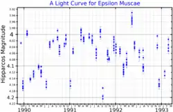 Epsilon Muscae, Latinized as ε Muscae, is a red giant star of spectral type M5III in the constellation Musca.[4] Originally a main-sequence star of around 1.5 to 2 solar masses, it is now on the asymptotic giant branch[3] and has now expanded to 130 times the Sun's diameter and 1800 to 2300 its luminosity.[6] It is a semiregular variable, varying in eight distinct periods ranging from a month to over half a year in length, with the largest amplitude being of almost half a magnitude from the mean of 4.06.[4] It is located around 300 light-years distant,[2] the same distance as the Lower Centaurus–Crux subgroup of the Scorpius–Centaurus association, although it is moving much faster at around 100 km/s and does not share a common origin.[6]