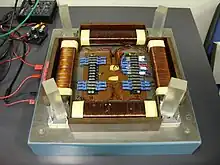 An Epstein frame or Epstein square is a standardised measurement device for measuring the magnetic properties of soft magnetic materials, especially used for testing of electrical steels.