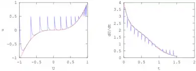 The solution of the differential equation rapidly moves to the slow manifold for any initial data. The coarse time-stepper solution would agree better with the full solution when the 100 factor is increased. The graph shows the lifted solution (blue solid line) . At times , the solution is restricted and then lifted again, which here is simply setting . The slow manifold is shown as a red line. The right plot shows the time derivative of the restricted solution as a function of time (blue curve), as well as the time derivative (the coarse time derivative), as observed from a full simulation (red curve).