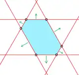 ![]() This convex direct equiangular hexagon, <6>, is bounded by 6 lines with 60° angle between. Each line can be moved perpendicular to its direction. |