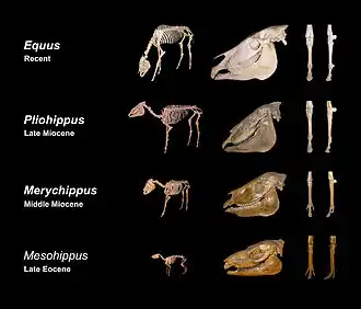 The family became relatively diverse during the Miocene epoch, with many new species appearing. By this time, equids were more truly horse like, having developed the typical body shape of the modern animals.[5] Many of these species bore the main weight of their bodies on their central third toe, with the others becoming reduced and barely touching the ground, if at all. The sole surviving genus, Equus, had evolved by the early Pleistocene epoch, and spread rapidly through the world.[6]