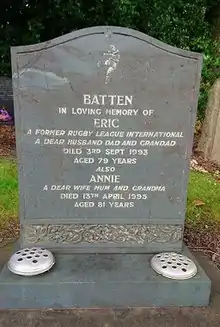 Eric Batten was the son of the rugby league footballer Billy Batten. Eric Batten's marriage to Annie (née Saxton, born c. 1914 in Wakefield district – died aged 81 on 13 April 1995) was registered during first 1⁄4 1937 in Wakefield district.[14] They had children; John Michael Batten (birth registered third 1⁄4 1940 in Hemsworth district) Janet Batten (birth registered first 1⁄4 1951 (age 71–72) in Hemsworth district), and Gaynor Batten (birth registered second 1⁄4 1953 (age 69–70) in Hemsworth district). He was buried at Lawnswood Cemetery, Leeds.