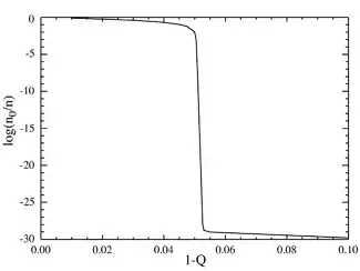 It can be seen that there is a sharp transition at a value of 1-Q just a bit larger than 0.05. For mutation rates above this value, the population of the master sequence drops to practically zero. Above this value, it dominates.