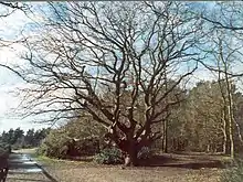 The Common was not always wooded, and much of the area was formerly open heathland used as common grazing land. It had not been grazed for many years and much of the area is now secondary woodland, including conifer plantations from the 1950s. Grazing trials began on a small area of Esher Commons in 2015. In the first year 15 goats were introduced to a 2.5ha area of heath for a period of six months.[7] Esher Commons Site of Special Scientific Interest covers a large part of Arbrook, Esher, Oxshott, West End and Fairmile Commons and the Ledges. Arbrook Common is the easternmost, named after the Arbrook, at other points and sources known as the 'Rythe'. Otherwise much of the remainder of the commons is a subterranean aquifer.[8][9] A programme to fell tracts of secondary woodland has led to various public protests.[10] In spite of the SSSI designation, the A3 Esher bypass was built through the middle of Esher Common in 1974. As compensation, approximately 90 acres (360,000 m2) of "exchange land" became part of the Commons. The Ledges were added to West End Common, and an area including Middle Pond became part of Esher Common.