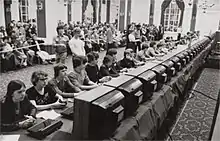 Contemporary esports has roots in competitive face-to-face arcade video game competitions. A forerunner of esports was held by Sega in 1974, the All Japan TV Game Championships, a nationwide arcade video game tournament in Japan.[12][13][14] The tournament was intended by Sega to promote the play and sales of video games in the country. There were local tournaments held in 300 locations across Japan, and then sixteen finalists from across the country competed in the final elimination rounds at Tokyo's Hotel Pacific. Prizes awarded included television sets (color and black-and-white), cassette tape recorders and transistor radios. According to Sega, the tournament "proved to be the biggest event ever" in the arcade game industry, and was attended by members from leading Japanese newspapers and leisure industry companies.[12] Sega stressed “the importance of such tournaments to foster better business relationships between the maker-location-customer and create an atmosphere of competition on TV amusement games".[13][12] In 1977, Gremlin Industries (a year before being acquired by Sega) held a marketing stunt to promote their early arcade snake game Hustle in the United States, involving the "Gremlin Girls" who were a duo of professional female arcade players called Sabrina Osment and Lynn Reid.[15][16] The pair travelled across 19 American cities, where players could challenge them in best-of-three matches for a chance to win money. The duo were challenged by a total of 1,300 players, only about seven of whom managed to beat them.[16]