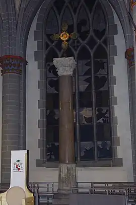 The oldest surviving fitting in the Minster is the column in the choir, which now supports a modern crucifix. Until the fifteenth century it supported a cross coated with a gilt copper sheet, from which the donation plate and probably other remains in the Cathedral treasury were made. The Latin inscription ISTAM CRUCEM (I)DA ABBATISSA FIERI IUSSIT (Abbess Ida ordered this cross to be made) allows the creator to be identified with the Essen Abbess Ida, who died in 971, though the sister of Abbess Theophanu, Ida, Abbess of St. Maria im Kapitol in Cologne has also been suggested. The column itself is probably ancient spolia, going by fluted pedestal and the Attic basis of the column. The capital was carved in antiquity, though exceptionally richly carved for that period. Stylistically it is related to the capitals of the west end and the crypt, as well as those of the Ludgeridan crypt of Werden Abbey and those of St Lucius's Church in Essen-Werden.